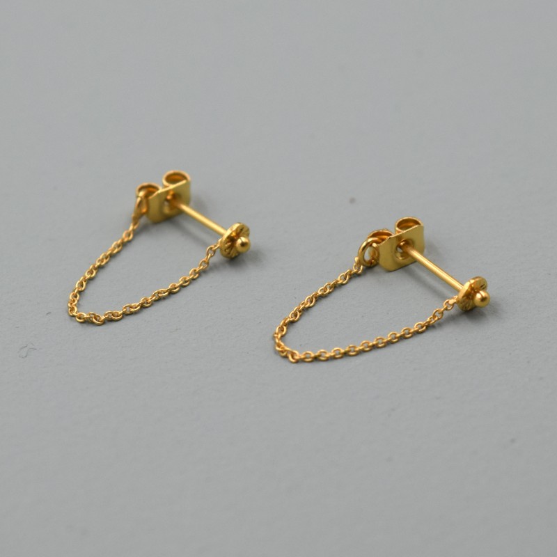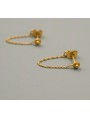 Boucles d'oreilles en laiton doré à l'or fin, un petit point au bout d'une chaîne qui se referme derrière l'oreille, la chaîne est accrochée à la poussette.