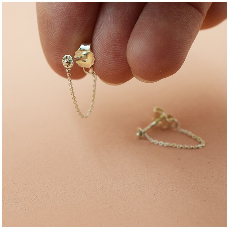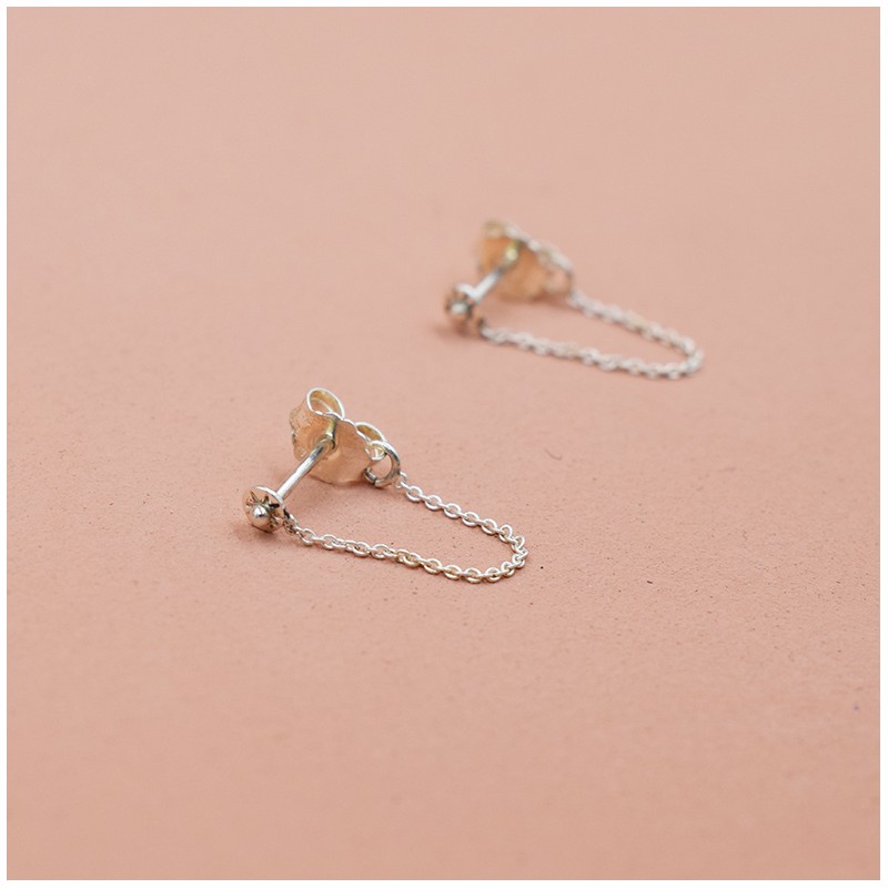 Boucles d'oreilles en argent 925, un petit point au bout d'une chaîne qui se referme derrière l'oreille, la chaîne est accrochée à la poussette.